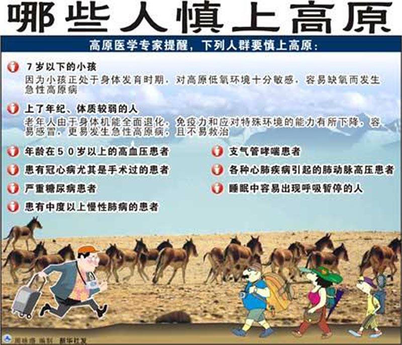1、進入高原前,可向有高原生活經歷的人諮詢注意事項,做到心中有數,避免無謂緊張。 2、進入高原之前,禁止菸酒,防止上呼吸道感染。避免過於勞累,要養精蓄銳充分休息好。適當服西洋參等,以增強機體的抗缺氧能力。如有呼吸道感染,應治癒後再進入高原。 3、良好的心理素質是克服和戰勝高原反應的靈丹妙藥。大量事例證明,保持豁達樂觀的情緒,樹立堅強的自信心,能夠減弱高原反應帶來的身體不適。反之,憂心忡忡、思慮過度,稍有不適便高度緊張的話,反而會加大腦組織的耗氧量,從而使身體不適加劇,使自愈時間延長。 4、如果你從未進過高原,在進入高原之前,一定要進行嚴格的體格檢查。嚴重貧血或高血壓病人,切勿盲目進入高原。