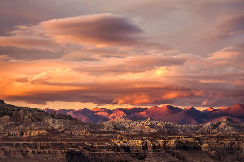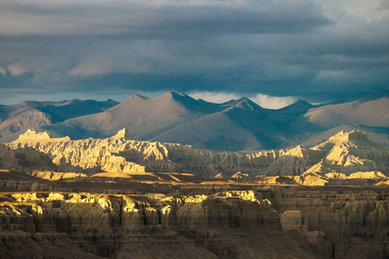方圆数百平方千米的范围内,高低错落的“土林”苍苍茫茫,千姿百态,在高原迷幻光影的衬托下,宛若神话世界。在高而平的山脊之下,严整的山体有的宛若一字排开的罗汉,有的酷似鳞次栉比的城堡,与美国西部的科罗拉多大峡谷有异曲同工之处。再找下和夕阳的映衬下,山纹明暗有致,色调金黄,景色迷人。狮泉河边的土林及附近废墟的佛塔在在暮色之中神秘而庄重。