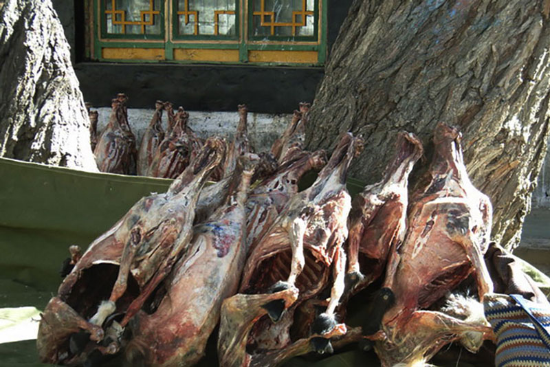 藏族人宰牲畜大多在初冬進行,因為此時牛羊正肥,非常有利於在高原的寒冬中進行冰凍。宰牛的方法主要是悶死,為的是讓血留在體內;宰羊時要先纏住四腳,然後用短刀子直刺至心臟。